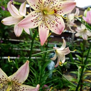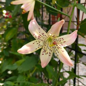 シャンデリアリリー 「コサージュ」 おはようございます♪ 雨上がりのしっとりとしたお庭で 可愛らしい百合の花が咲きました🤗🌸✨ 今日は、良いお天気になりそうですね☀️ 花壇にジニアやトレニアなどの植え付けをしようかなぁ〜☺️💕