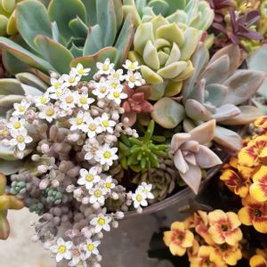 増え過ぎた子達を寄せ植えて1ヶ月経ちました。 紅葉も覚めて、ボンヤリした寄せ植えになってしまい、写真も撮らずにいましたが、 🤗パープルヘイズの花が咲いたら、ちょっとだけ可愛くなりました💖 梅雨とこれからの夏の暑い時期の水やり、、、、 去年は、多肉の寄せ植え教室で作った物の中で、薄葉のエケベリアをダメにしてしまいました😭 完全に水やりのし過ぎでした。 梅雨時期なのに、大して雨も降らず、昨日も33℃、明日もそのくらいの予報です😓 葉焼けよりも、ジュれる方が怖いらしいので、気をつけて水やりしたいです。 まっ、完璧は無理だから、そこそこに頑張ろう😌