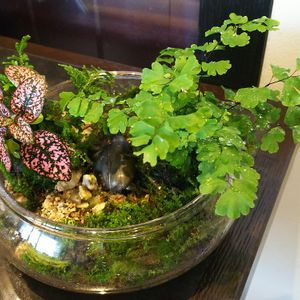 テラリウム 講座で作りました。 苔玉とはまた違う感じで、初めての体験でした。 思ってたより難しかったけど楽しかった~😆 お水をたっぷりあげて育てるそうです。 👴「盆栽はええよー😁」と言いたくなりますね👍 唐草蓬莱羊歯(アジアンタム) 雀斑草(ソバカスソウ ピポエステス) 黄金羊歯 苔色々… 佐治川の砂 岐阜の砂利 ケト土 海岸の石 水苔