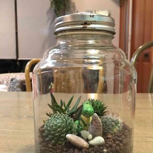 こないだお花やさんで見たテラリウムが気になっていました。大掃除をした娘がおやつを入れていた瓶を捨てようとするので、丁度いいかもと初挑戦❣️ オール100均のサボテンと多肉たち。 寂しかったので、トイストーリーのレックスをIN🌵お花やさんのお洒落な感じとはかけ離れちゃったね〜〜
