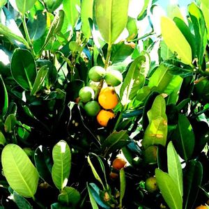 【南国シリーズ】 フクギの実 (福木) 街路樹に実がなっていました。 柑橘系の実かな、おいしいのかなと思いながら、写真を撮り、調べてみましたが、違いました。 木の実は、コウモリが食べるそうです。 ほんと、そうらしいです。 フクギと言われてもピンときませんでしたが、南国フルーツのマンゴスチンも、フクギ属です。 この木と実は、テリハボク(照葉木)の葉っぱと実にとてもよく似ており、どっちなのか見分けるのに苦労しました。 テリハボクの方が葉脈がはっきり見える のですが、写真の木の葉っぱはそうでもないので、テリハボクではなく、フクギだと思いました。