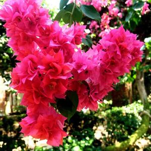 【南国シリーズ】 ブーゲンビリア さすが、南国! とてもきれいに咲いています。 葉っぱの緑も輝いていて、花のピンクととてもきれいに合って、鮮やかです。 ブーゲンビリアの花言葉は 「情熱」 「あなたは魅力に満ちている」 「あなたしか見えない」 だそうです。 ちなみに、ブーゲンビリアのほんとの花って、花の中央部にある小さな白い部分だそうですね。 花びらに見える部分は、包葉(花を取り巻く葉)だそうです。 そういうのは、よくあります。