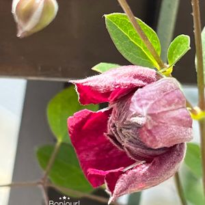 クレマチス❤︎ ✨プリンシパル ✨ 咲き出した! 昨日 写真を撮ろうとしたら…、花にナメクジ痕😱⁉️ かたまり感、濡れ感… いくら雨上がりと言えどもー違う👊、🐌いっぱい花を横断しているやん!😭 小さい花だからな〜、こんな高い所までくるんだー⁈ 被害前のpic👆