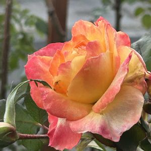薔薇 シャコック 花弁の縁が波打ち中心部が濃黄色の 上に紅色のチェンジング(色変わり)が美しい。 半剣弁高芯 咲き、花径は10cmで中輪、四季咲き 我が家唯一のオレンジ系 オレンジやイエローの薔薇はなかなか良い花が見つからず お勧めがあったらお願い致します🌹 今日も素敵な日の始まり🌹
