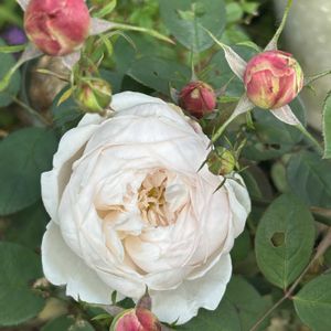 薔薇 フェアビアンカ 80年代に作出された古い品種だが未だなお根強い人気のフェアビアンカ 房咲きで花つきもよくミルラの強い香り 名はシェイクスピアの作品中の登場人物にちなむ いつもはホワイト又はオフホワイトですが寒さでほんのりピンク色に🩷 今日も素敵な日の始まり🌹
