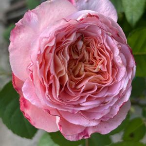 薔薇 アウグスタ ルィーゼ 花色はアプリコット色から桃色 花弁の基部が黄色 花弁が波打つロゼット咲き 夏はアプリコットが強い様な タグの写真より花弁が多いのに驚き🌹💓 今日も素敵な日の始まり🌹