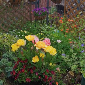 こんにちは😊🎶 今朝、少し曇り空☁️の時に撮りました(*´∀`)🌿 八重咲きチューリップ🌷が濃い色に見えて、いつも色々な場所から出てくる淡いオレンジ色のケシ(右端)の花が可愛いかったのでパチリ📸 隅っこ花壇にはら種から育てたビオラや忘れな草、零れ種のノースポールが咲いています🤗✨
