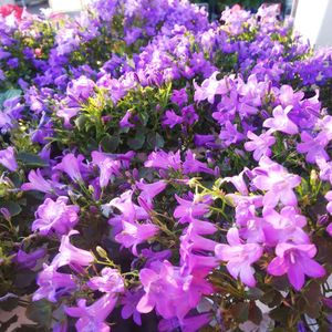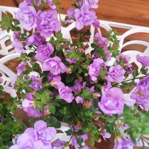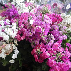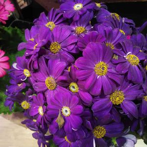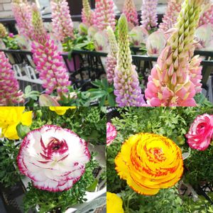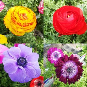 いろいろなラナンキュラス 紫色の花、赤い縁取りの花