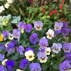 こんにちは☀️ まだまだ元気なビオラさん❣️ 今日は、いつもより顔が可愛く見える ような気がします😄👍 後ろのキャットテールさん、 無事、冬越し出来ましたよ〜❤️♪♪♪