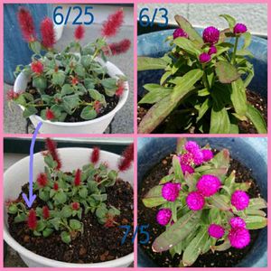 6/25 バジルは順調🌱 千日紅もまたひとつお花が増えた🌼 キャットテールも赤もけ増えてきた❗ ウチョウランが絶不調… 苔が茶色く、茎の根本も黒くなってきちゃった😣 どうしたら元気になるかな💦