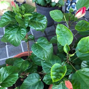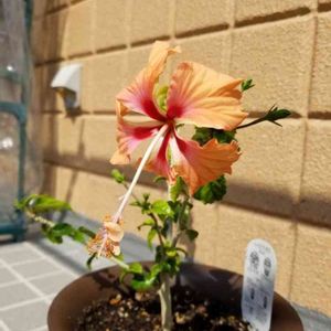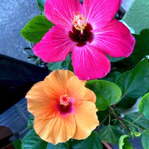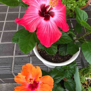 今日のお花、ハイビスカス。 これはうしろの大きな花の中央から茎がのびて前にも花が二重咲きするフラミンゴ。 たくさん蕾をもってたけど、軒下でも最近の雨風でほとんど落ちてしまいました😓 少しさみしいけど、そのかわり株が育ってくれるはず、と、思おう。。🌱