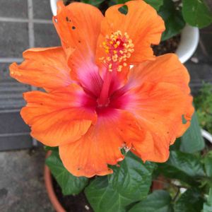 大好きなオレンジ🧡ハイビスカスさん🧡 なんか微妙な違和感を感じて気づきました 花びらが通常5枚のところ、もっとあるんです😅😅💦ちょっと虫に食べられちゃってるのはご愛機ですが、花びらにはびっくりでした‼️