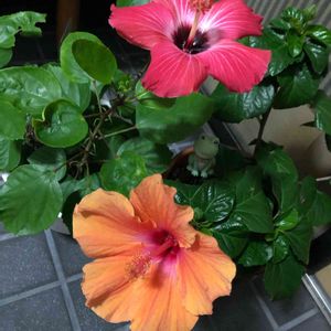 出かけて夜帰ったら なんと赤いハイビスカス🌺さんが咲いてくれてて、3日目🧡オレンジハイビスカスさんとコラボ実現しました もしやオレンジちゃん待っててくれたのかなぁ😊😍🙌🧡