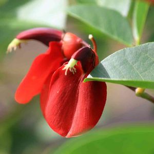 亜米利加梯梧(アメリカデイゴ)/海紅豆(カイコウズ) マメ科デイゴ属の落葉小高木。ブラジル原産で江戸時代末期に渡来し庭木として植えられる。枝や葉柄には棘がある。葉は卵状楕円形で表面に光沢がある。長い柄があり互生する。裏面は無毛で白っぽい。花期は6~9月。葉が茂った枝先に赤い花をたくさん咲かせる。花は長さ5㎝ほどの蝶形で、丸みのある幅の広い旗弁が下側になって咲く。花はデイゴに似ているが、本種は花期に葉が茂っている。 歌などで耳にする梯梧(デイゴ)は本種の仲間で沖縄県の県花。名前は、中国南部の呼び名『テイコ』に『梯梧』という漢字が当てられていたのを音読みし、やがて音がデイゴに変化したとされる。 出典『樹木の事典600種』『樹木の名前』