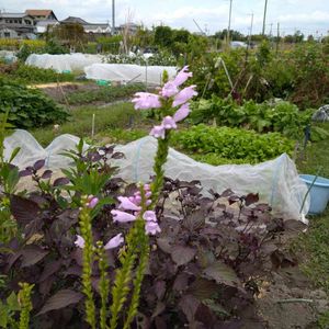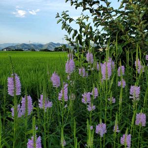 おはようございます。花畑から北の眺めです。 田んぼに囲まれた花畑、たんぼとの境目には背丈の高いものをうえています。 花トラノオ自然に広がってきました。