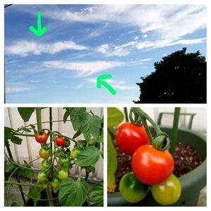 だんだん!いろずいてきました🍅🍅🍅。たくさん採れたら一部凍らせてビール🍺に氷のかわりに入れます❗️レッドアイ🍻❗️ 空にクモナガスクジラ発見🐳スマホ📱取りに行ってる間に尾っぽが消えちゃった。上には龍神さま~🐉❗️今日も縁起がいいぞ~!🙏😊😆😄