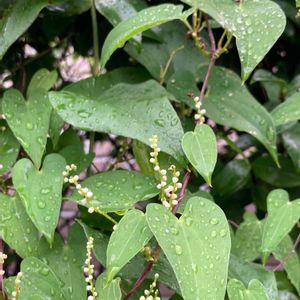 ☔️降って涼しい朝。ヤマノイモの雄花が近所の生垣に絡みついてます。朝散歩より