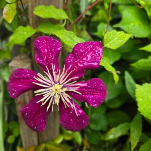 クレマチス ①☔の中のしっとりクレマチスさん💜💜💜 ②八重咲きクレマチス新紫玉さんは6月初旬に開花💜💚💜 ③今朝は、薄いパープル💜🤍クレマチスさん開花(*´∀`)♪✌ ④毎年この時期に咲いてくれます(●’∇’)♪