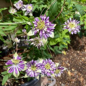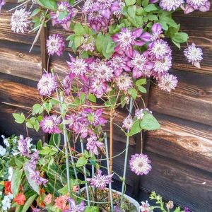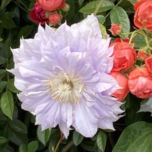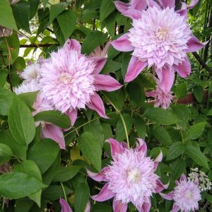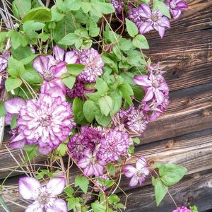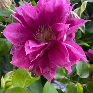 大輪の八重咲きクレマチスが咲き誇っています😊 一昨年母が買ってきたのですが、 品種名や扱い方がわからなくなってしまい💦 去年は枝を切りすぎてしまったようでお花が咲いてくれず😅 もうだめか…と思っていたら、1年おいて今年また花を見せてくれました✨