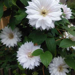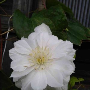 散歩道のクレマチスに八重咲きさんが加わりました 白から黄緑色のようなこの綺麗な色は👀 品種名は分かりませんが素敵な花です✨