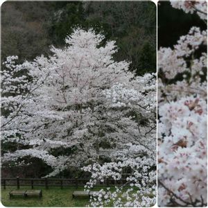 こんにちは~☀️ 今日は晴れていますが、黄砂の影響で黄色っぽくぼんやり霞がかかったようです。 「火曜ベンチ」 徳島との県境にある美霞洞渓谷、ソメイヨシノよりかなり大きなサクラの木の下にひっそりと佇むベンチがありました。 このサクラ、ソメイヨシノ(右下半分)と比べて花弁がかなり小さく、粉雪みたいに見えました(右上半分)。 このサクラの名前分かる方教えてください。 撮影日 2021.3.27