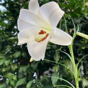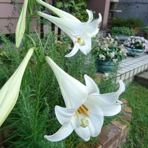 庭では、てっぽう百合が咲いています。 球根で植えたものから種がとんで、毎年あちらこちらで咲いてくれます♬* .ʚ♡⃛ɞ(ू•ᴗ•ू❁) ★赤い筋があるものはタカサゴユリだと教えていただきました✨
