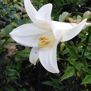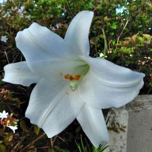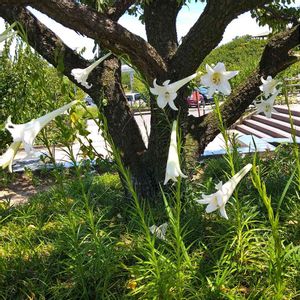 庭の隅にタカサゴユリが。茎の長さと花の長さが同じくらい‼️頑張って咲いたんですね😊