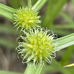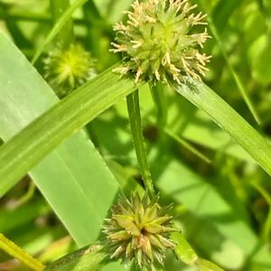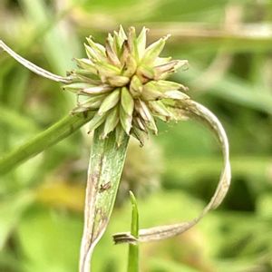 ヒメクグ(姫莎草) カヤツリグサ科カヤツリグサ属 花期:7〜10月 ヒメクグと思われるものを沢山撮影していたのですが、似たものにアイダクグというのがあり、アイダクグの小穂の鱗片に小さな刺があると知り、改めて近くで撮影した2ヶ所を見に行ってきました。 一ヶ所は既に綺麗に刈り取られ、もう1ヶ所はまだありましたが、もう終盤の姿でした。 ・小さな株で美しい時期は過ぎていました。 ・改めて見ると小さいです。 ・丸い小穂の集まりの大きさは0.8㍉くらい。 ・草丈10〜20㌢くらい。 ・茎の先に長い葉状の苞葉が2〜3コあり、その間にまん丸の花序が付いています。 ・茎は三角形 問題はここから… ⑤綺麗に撮れませんでしたが、アイダクグなら小穂鱗片の竜骨にトゲが数個出るそうですが、見えませんよね〜 これを見る為に今更ですが、ヒメクグを探しに行ってきたのです。 また、全体としては、アイダクグの方が草丈が高くなる傾向があるのと アイダクグの花序はやや楕円形が多いようです。 来年は綺麗なヒメクグを投稿したいと思います。 違ってたら教えてください。 📷 2024/11/27 湿った草地