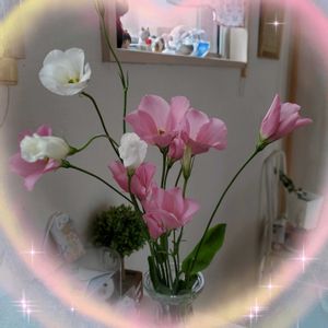 こんばんは😃🌃 台風の影響で風が強い一日でしたね😭 🌧️も降ったり、やんだりでムシムシが嫌ですね😵 娘が買ってきた花達の中にこんな子がいましたが、可愛いので、この子達だけ眺めることにしました~🎶 調べたら、トルコギキョウと教えてくれますが、そうなのでしょうか⁉️