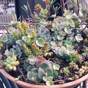 ミセバヤ❀ GSでお友達になったなつ子さんからの素敵便♫ 可愛いリメ鉢💕 少しだけで、紅葉し始めたミセバヤを植えてみました。これは娘からもらった🍁あとの鉢は何を植えようかと?妄想中❣️ なつ子さん、ありがとう💕 今日は過ごしやすそうです。3日連休したあとの、仕事は行きたくないなぁーー💦