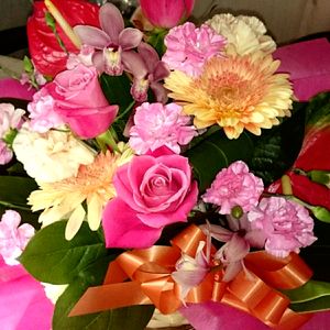 昨日は妹の誕生日でした。 アレンジ花を注文して、送りました。 スカビオサオリンピアmix スイトピー白、紫、 デルフィつぼみ、 ラナンキュラスピンク トルコキキョウ紫、ピンク ポリシャス、ジャバダ、 ピンクスター、ホワイトスター