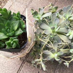 こちらも頂き多肉なのですが、種類がサッパリ分からなくて… もらった時はもっと水分たっぷりでぷくぷくだったんですが、なんだかトゲトゲしています😢 それでも新しい子が横から出て来てくれたり、 奥のものは黒く変色してきてるような気がするし…💦 それぞれどうしてあげたらいいんでしょう❔(。>_<。)