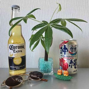 夏休みだ!シーサーオリオンに参加させていただきます ( ^ω^ )♬ うちに来て3回目の夏を迎えるパキラ。 セラミス植えから毎年している夏季限定の根腐れ防止剤敷きのゼリー植えに🌴 家族にはインチキなんちゃってチャ◯ニーズ◯フィアみたい💧だと大不評だった😑先月の蚤の市で一目惚れしたヴィンテージサングラスもお邪魔させて♬ 短パンにビーサンでタオルハチマキでこれ🕶掛けて… 蒸し暑いこの盆地から抜け出して、未だ見ぬ沖縄の海でビール片手にバーベキューしてみたいっ‼️ 🍺٩(ˊᗜˋ*)و🍖✨