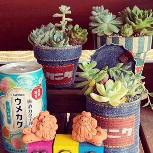 元気な多肉さんたちとシーサーと飲み物。 「夏休みだ!シーサーオリオン」に参加します。😄🎶 忘備録さんからいただいた、真っ赤なシーサー。 📷目線です。😊✨ アンチエイジングのために最近はまっているどぶろく。毎日150cc位飲んでいます。お肌がプルンプルン⁉️😆 頑張れ❗日本‼️ ✊‼️