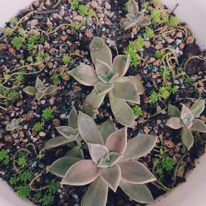 なんだかピンクがかってきた朧月ちゃん🍀 真ん中の子は初代で何度も倒れて傷だらけにしてしまったけど、頑張ってくれてるかわいい子♥️ 周りのセダムちゃんはほぼ置いただけ💦 無知な私を許してね🙏💦 みんな枯れずにいてくれて感謝です❤️