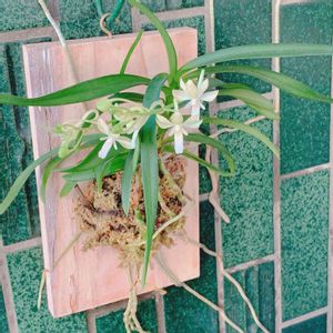 バンダグリーンライト💚 お迎えして3年目。 初めて咲きました🙌💞 …この子はバンダと風蘭の交配種。今まで屋内でバンダ寄りの育て方をしていましたが、花芽すら上がってこなくて😭💦 春に板付けして風蘭のように外に出したら咲いてくれました🤗 爽やかないい香りがします♪ でも、冬越しは屋内。。。壁に張り付いた根っこを剥がすのがかわいそうだなぁ😅