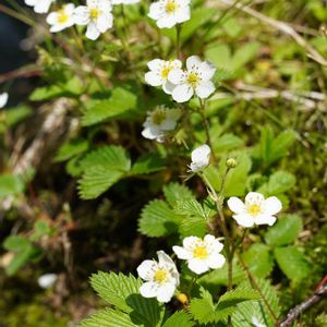 ここ千手ヶ浜一帯には、先のサンリンソウの他に二種類の白い花が点在してます。 その一つが「シロバナノヘビイチゴ」。 ヘビイチゴと名がついていますが、バラ科キジムシロ属ではなくオランダイチゴ属なので、市販のイチゴと同じ姿の実をつけて美味しいですよ😋 結構高い山にまで分布しますね。