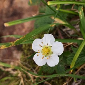 黄色くなくて白い花、シロバナノヘビイチゴですね😍 ヘビがついてますが、ヘビイチゴ類のキジムシロ属ではなく、美味しいキイチゴ属でもなく、普通のイチゴ🍓のオランダイチゴ属になりますので、ふつうに美味しいです😋 結構高い、日光白根山の頂上とかにもありますね⛰