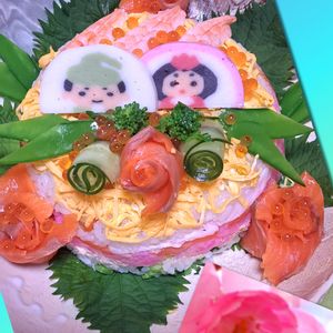 今日は、「雛祭り🎎」✨️🎶 お花ではありませんが🙏💦 「雛ケーキ🎂」作りました🎵 一番下が、菜の花ご飯😋 真ん中が、ビンクの桜でんぶ😋 一番飢えがちらし寿司😋 それぞれ間にエビやサーモン、ツナマヨ💕入れてトッピングは、いつもの「生協」さんのお雛様かまぼこ🤭 サーモンで、バラ🌹を作ってキヌサヤやイクラを散らして💖 召し上がれ~(’-’*)♪❤️ 久々に登場…自作の器