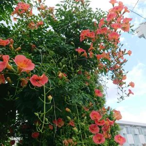 ノウゼンカズラ ノウゼンカズラ科 ノウゼンカズラ属 落葉性のツル性木本 古名は「ノウセウ」または「ノセウ」それが訛って「ノウゼン」となった。また蔓が他の木に絡みよじ登る為「カズラ」の名がついた。 花や樹皮は漢方薬では利尿や通経に使われる。 向かいのマンションの駐車場脇に咲いて、とても綺麗だったので写真にとったのですが、花の下はとても悲惨です! 7月17日の撮影ですが、8月6日に実家から帰ったらこのノウゼンカズラはキレイサッパリ無くなってました😅