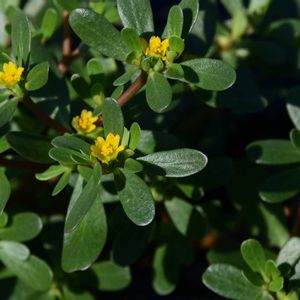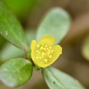 スベリヒユ(滑り莧) スベリヒユ科スベリヒユ属の一年草 ヒユの仲間ではない 別名 ヒョウ∗ヒデリソウ∗スベラン草など多数 日本全土に分布 道端や畑で、よく見かけますが、 田んぼの畦道にも生えていました。 栄養が行き届いているのか、 園芸品種のポーチュラカには及びませんが、 葉っぱも花も、道端のものより大きかったです。 朝、花が咲いていたのに、 お昼過ぎには、閉じて、開いた花の姿は、見当たりませんでした。 花の真ん中には、たくさんの雄しべがあり、 ペン先などで、そっと触れると、 一斉に触れた方向に頭を向けるそうです。 やって来た虫たちに花粉をつけようとしているそうです(^o^)