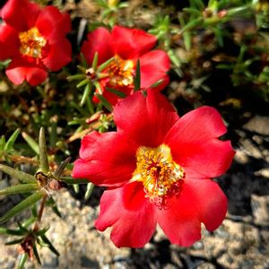 先日義母がお迎えした栄養系ポーチュラカ カンピーノ 蕊が可愛いです💕 普通のポーチュラカよりはお花が大きめで鑑賞時間も夕方までと幾分長めらしいです (和名はハナスベリヒユ) お日様が大好きで太陽があたらないと咲いてくれません😅 カラフルに咲いても夕方には全て萎れて毎日花殻摘みが欠かせないです💦 暑い夏でも強くて10月まで咲いてくれるなら有り難いですね 伸びすぎてきたら切り戻して挿し芽も出来て増やせるとか… 切り戻ししたら消毒スプレーして肥料を3カ所に置くといいとかYouTubeで見ました