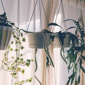 紐サボテン✨ 左がフリマサイトで1本だけ購入した子🎵 おおきくなったけど1本じゃ淋しい…けど、挿して増やすのも勇気が💦と思ってたら、 マルシェで右の親株から4本生えてる子を発見✨ 念願のハンギングにしました😆💕まだまだ短いけどこれからの成長が楽しみです🎵