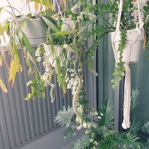 夏のインナーバルコニー✨ 洗濯物干場なので端によせて吊ってるから日当たり悪いです💦 が、元気に育ってくれてます😊 特に紐サボテンが伸びていい感じになってきました🥰