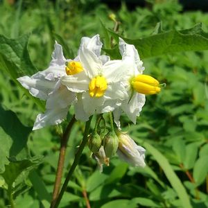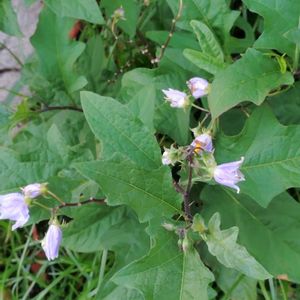 夕方の散歩道で🌆🚶 総合運動公園内の散歩道の道端にワルナスビがありました👍 芝生から生えていて背はかなり低いですがお花がありました🌸🌿🍆🍅 小さいけど鋭いトゲもあって痛そうでした😣👍 お花は可愛らしいですが🥰✨👍💕