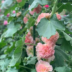 八重咲きタチアオイ🌺 タチアオイの八重咲きは 初めて見ました❣️🥰 花色もフォルムも可愛い❤️ ラッキーのちょい調べ👀👇 アオイ科タチアオイ属(ビロードアオイ属)に分類され、一年草と二年草、多年草の品種があります。タチアオイ(立葵)は和名、ホリホック(hollyhock)は英名で、一番上の花が咲くころに梅雨が明けるといわれることから、別名「梅雨葵(ツユアオイ)」とも呼ばれます。 高さ1~2m以上まで伸び、開花期の6~8月には直径10cmほどの花を下から順に咲かせます。種類が豊富で、暑さや寒さに強く育て方が簡単なため、初心者の方も気軽に栽培できます。 **✿︎❀ ❀.(*´▽`*)❀. ❀︎✿︎*