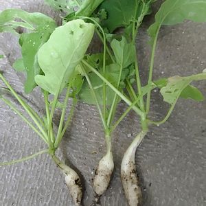 【大根】 そーいえば、大根収穫しました ずいぶん前に 😁 初夏の涼しさに 花芽が出過ぎて成長が止まり 食べれるうちに 葉っぱとミニミニ大根を食しました😁 大根の成長も早く 楽しかったです。 次回は 遅い時期に 種まきしても 良いかも、、、でした( ̄^ ̄)ゞ