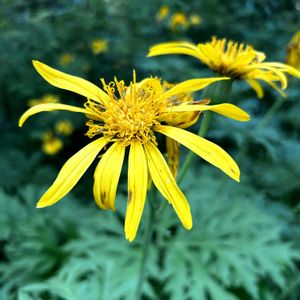 ハンカイソウ(樊噲草) キク科 メタカラコウ属 花期 6〜8月 高さ50〜100cmで、山地の林内や湿った草原に生える多年草 在来種、本州(静岡県以西)、四国、九州、朝鮮、中国、台湾、インド 名前の由来は豪壮な姿を中国の武将に見立てたもの 根生葉は長さ20〜100cmの葉柄があり、葉柄の基部に短い鞘がある。 葉身は腎臓型〜円心形、掌状に3〜5全裂し、更に羽状に深裂する。 頭花は頭頂の散房花序に2〜8個つき、直径8〜13cm 筒状花と舌状花からなる 1メートルくらいで、大きな花である為、遠くから見てもよく目立つ 葉も大型です 森林伐採などにより、一部の地域では絶滅危惧種になっている希少な花です 花の終わり頃になると花弁が垂れて、エキナセアのような感じになっています