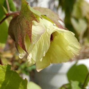 地味にGS友達からいろいろな花の種や多肉の苗を頂いているラーメン、つけめん、僕イケメンカメラマンですが、これは、あっぴーさんから頂いた綿花の花です。ようやく最初の花が咲きました。花が下向きに開いているので、どう撮れば花の形を皆さんに解って貰えるか悩みましたが、これはまだ開花途中なんですかね?花の根元に葉っぱがくっついてると思ったら萼(がく)でした。面白い形の萼ですね。