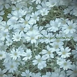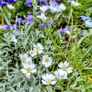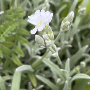【セラスチウム(白耳菜草、夏雪草)】 ヨーロッパ原産、ナデシコ科常緑多年草(一年草扱い) ヨーロッパの高山植物。 初夏に小さな白い5弁花を茎の先端につける。 花弁の先がハート型に裂け、中心部から縦に筋が入る。 花も美しいが、白い毛で覆われたシルバーリーフも美しい。茎は地面を這い、マット状に広がる。 草丈:15~25cm 花期:4~6月 花色:白 ガーデンマルシェ防府にて